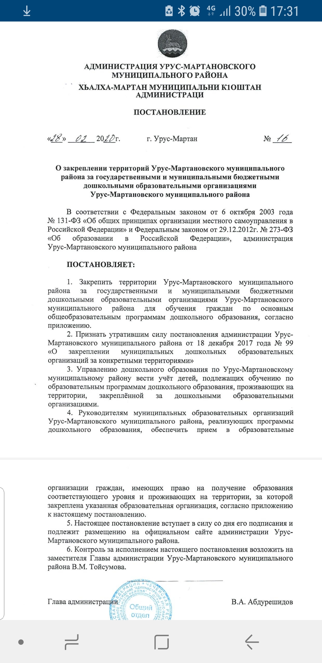 О закреплении территорий Урус-Мартановского муниципального района за государственными и муниципальными бюджетными дошкольными образовательными организациями Урус-Мартановского муниципального района