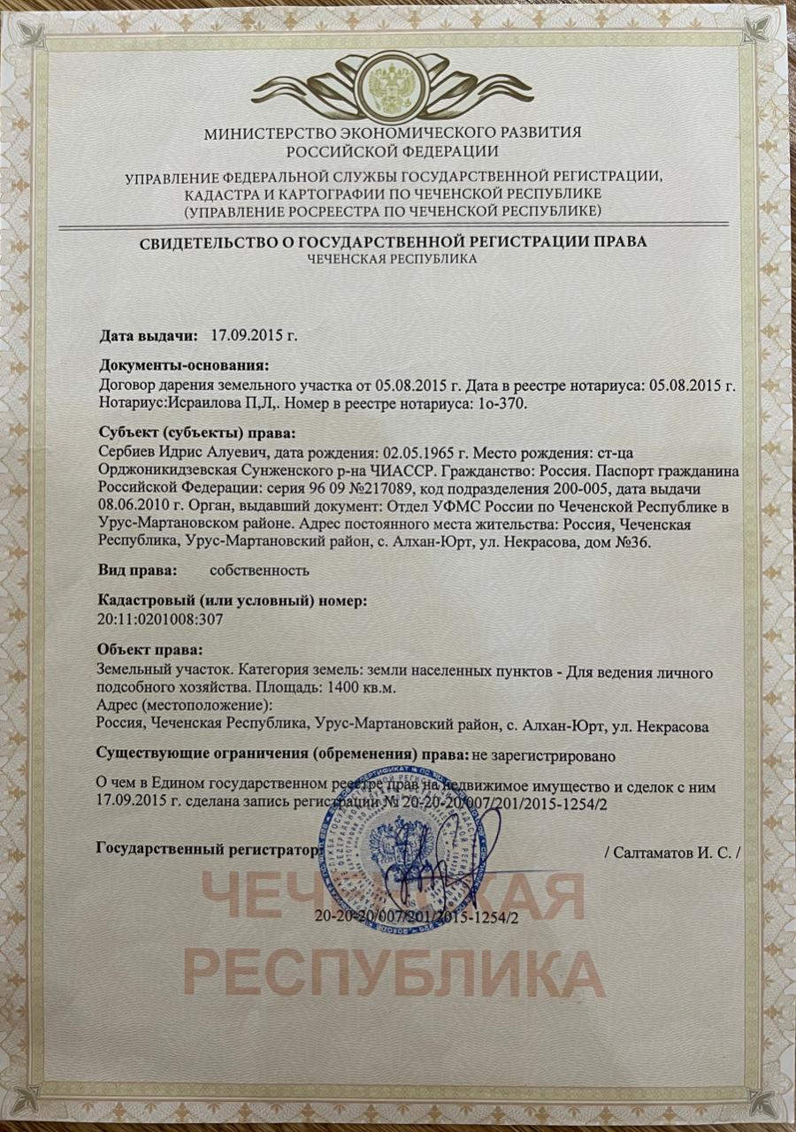 Свидетельство о государственной регистрации права (документ о закреплении территории)